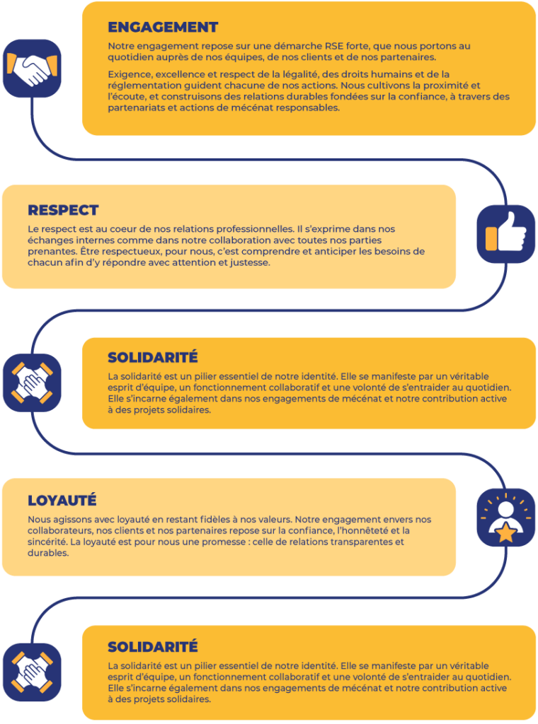 Exigence, excellence et respect de la légalité, des droits humains et de la réglementation guident chacune de nos actions. Nous cultivons la proximité et l’écoute, et construisons des relations durables fondées sur la confiance, à travers des partenariats et actions de mécénat responsables.